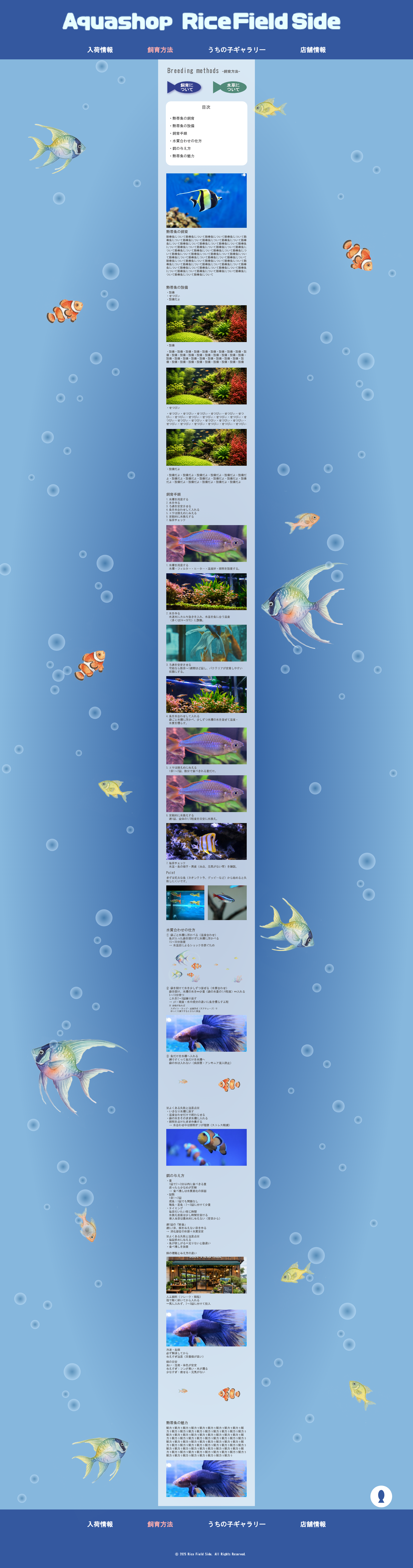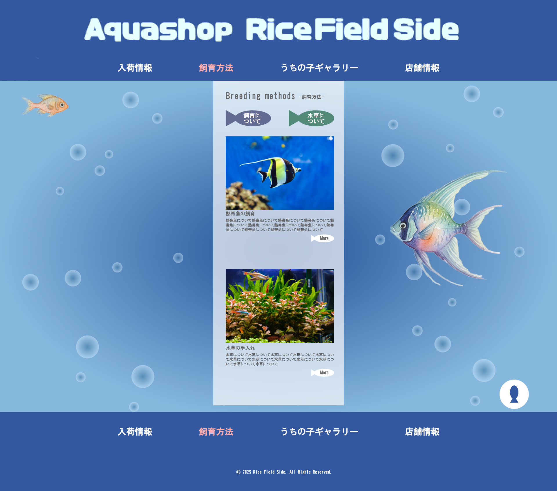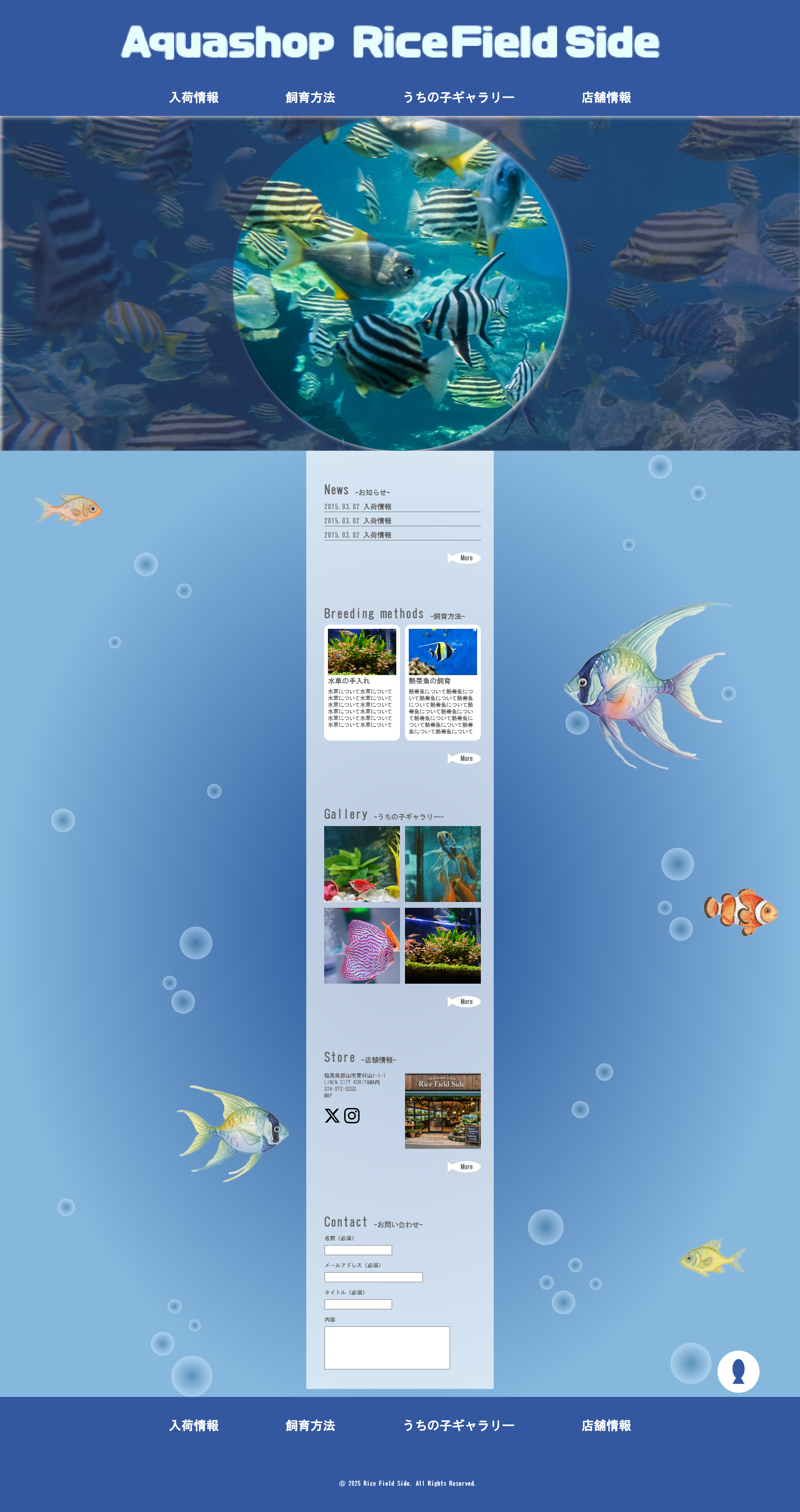職業訓練の制作課題。アクアリウムショップ「Rice Field Side」のWebサイトを想定し、