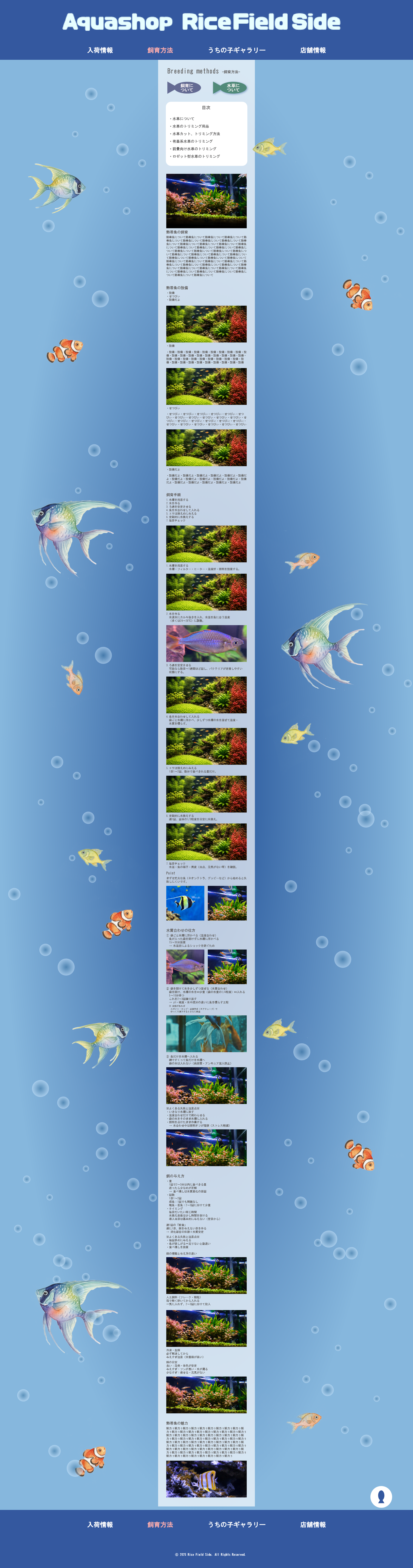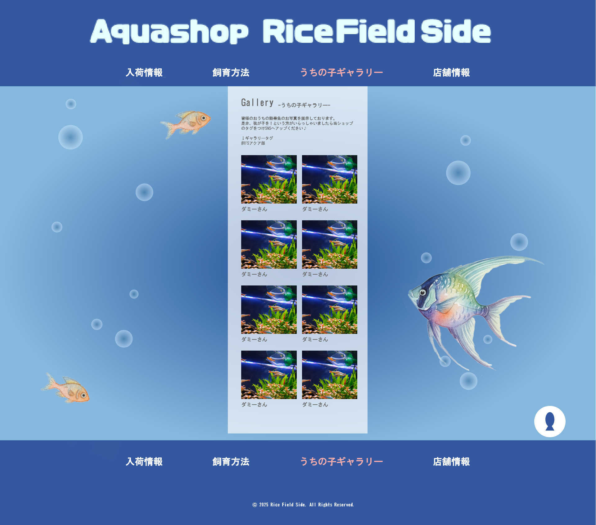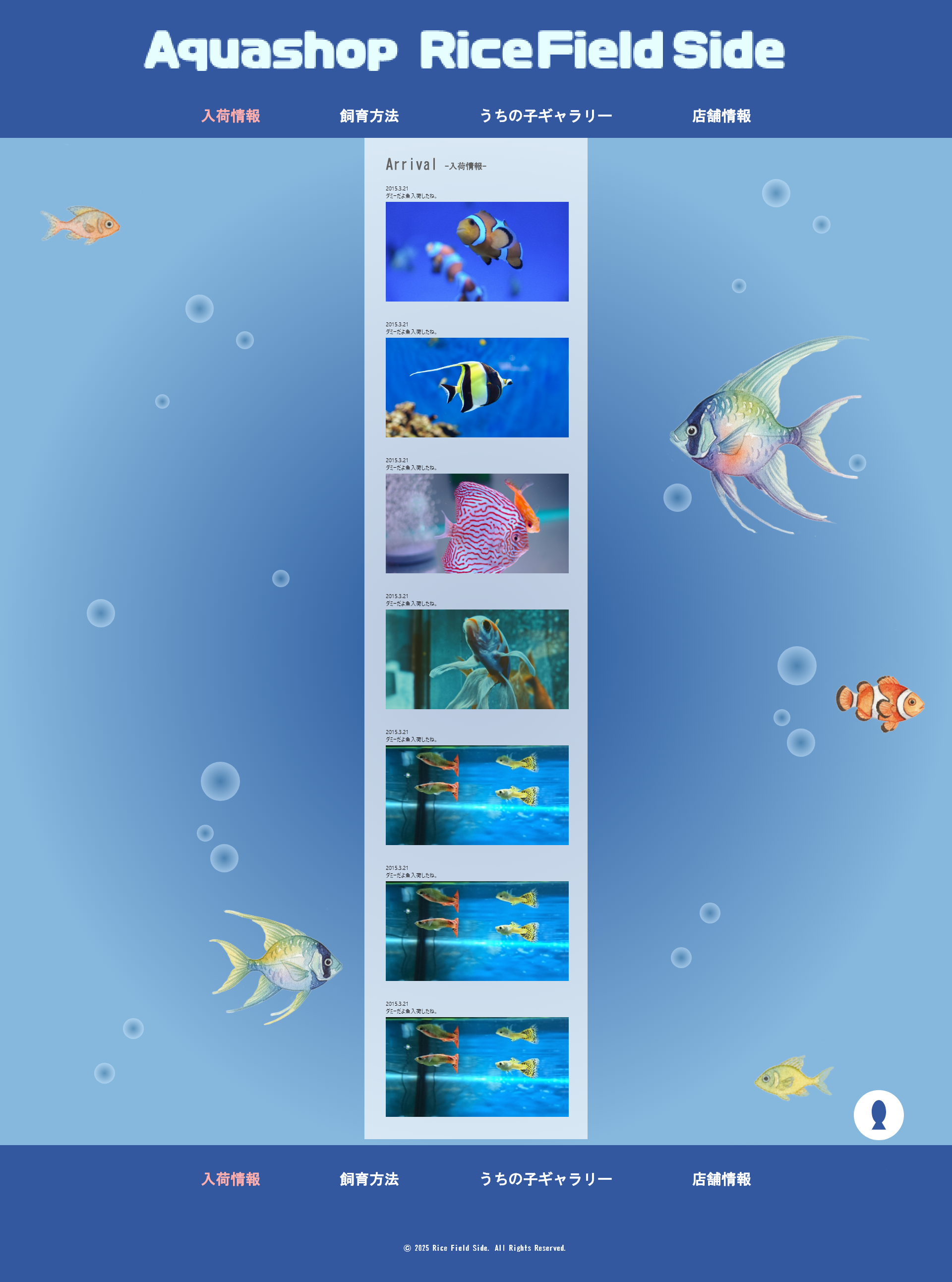 職業訓練の制作課題。アクアリウムショップ「Rice Field Side」のWebサイトを想定し、