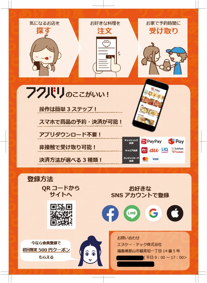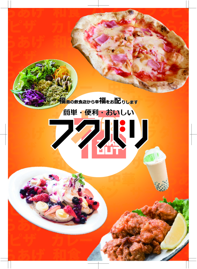 職業訓練の制作課題。地域密着型デリバリーサイト「フクバリ」のチラシを制作した。
