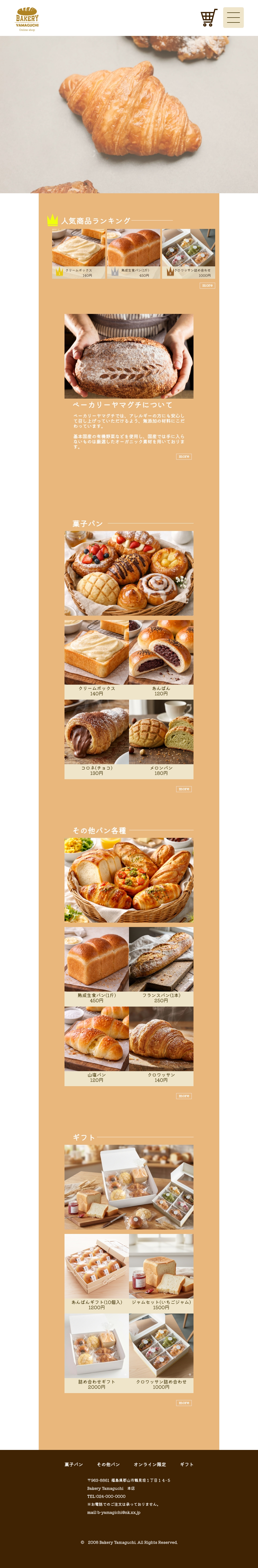 トップページでは人気商品のランキングを最上部に配置し、続けてベーカリーヤマグチの紹介を掲載し、公式サイトへの導線を設けている。